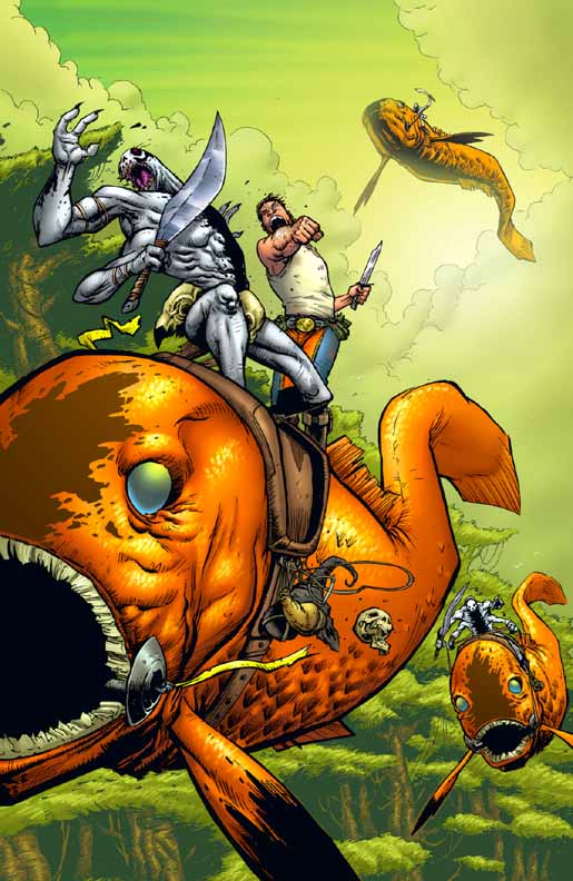 You really do feed off of the art and so we worked up that first sequence in Hatchet Job where there were these barbarians riding gold fish around this tropical planet and that’s an idea that I wouldn’t have come to by myself. That’s the kind of thing that you come to collaborating and building off the visuals.