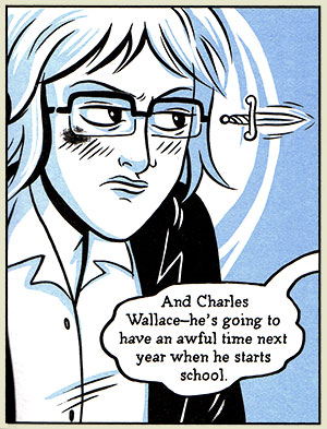 In adapting A Wrinkle In Time, Hope Larson has been able to take her gentle style and bring to life the imaginative concepts that L’Engle provided in the original text. For those unaware of Larson’s work, she has an ability to visually represent emotion and feeling in that modern independent comics kind of way. When Meg is frustrated at school early in the book, we can feel that frustration through subtle details in her eyes and body language. We can feel the innocence, oddness and sense of something not being at it seems when we see Charles Wallace. And finally, Larson is able to bring to reality the aliens, planets and other out-there aspects of A Wrinkle In Time in a way that is both true to L’Engle’s original work and relatable to today’s readers. It’s no easy task to explain the interplanetary travel aspects, and I can’t imagine how L’Engle described it in her book, but it plays to the strength of the graphic novel format that we’re able to visually see the concepts of dimensions and space travel. Additionally, Larson’s approach to the adaptation is effectively simple. Keeping to the basis of a 9 panel grid underneath, Larson expands and contracts her layouts as necessary, but always serving the story. With the single color of blue providing accent to the black and white art, the book carries a somber, blue-like mood throughout which fits perfectly through every moment of the adventure. When you look at Larson’s work on A Wrinkle In Time, it becomes another shining example of what a graphic novel can be.
